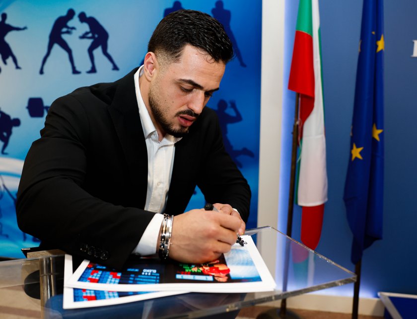 Министърът на младежта и спорта Иван Пешев връчи почетен плакет и парична премия по наредба №5 в размер на 115 хиляди лева на световния шампион в щангите Карлос Насар.