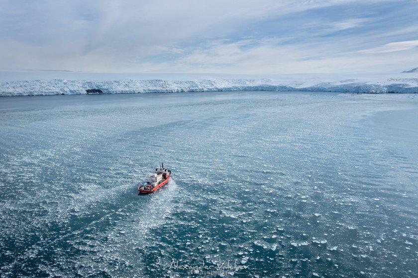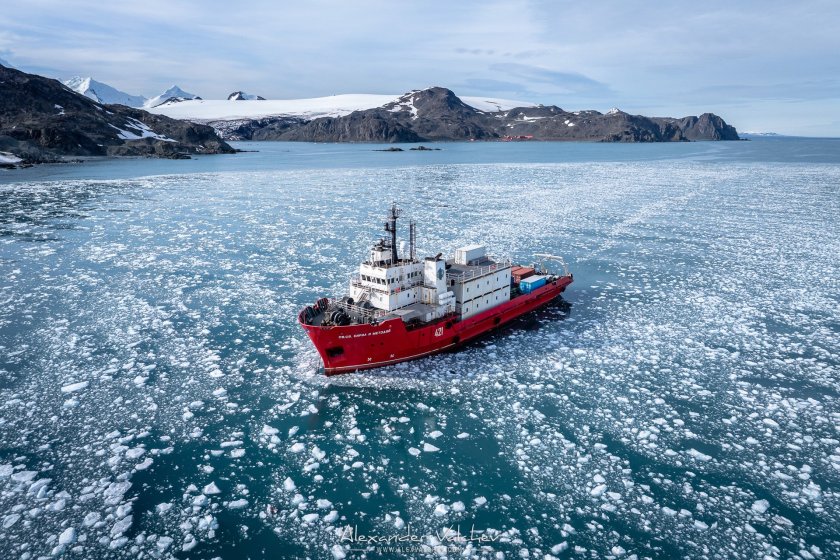 Научноизследователският кораб "Св. св. Кирил и Методий" (НИК 421) в близост до Българската антарктическа база "Свети Климент Охридски" на Ледения континент през погледа на Александър Вълчев