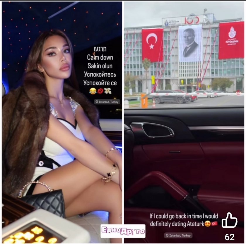 В друго свое стори тя сподели, че ако можеше да се върне назад във времето, би искала да бъде жената до Мустафа Кемал Ататюрк – вдъхновена от последното си посещение в Истанбул и силната харизма на турския реформатор.