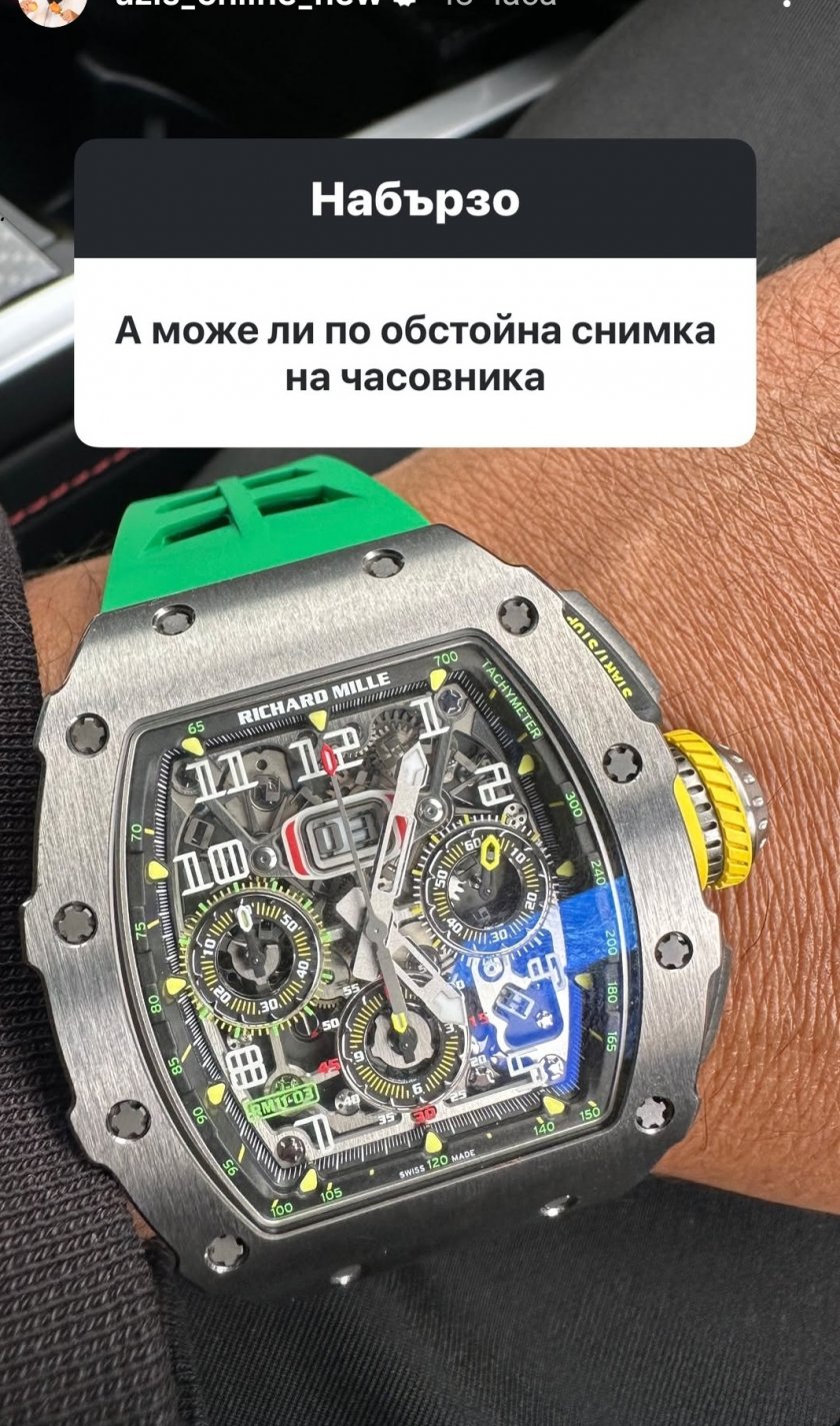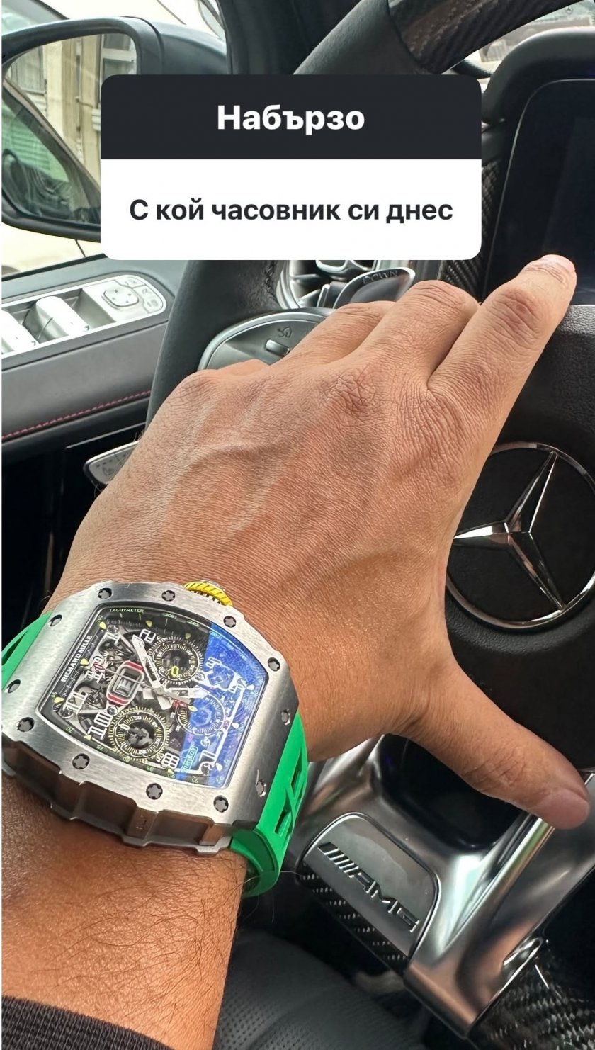 Според експерти часовникът, който краси китката му, е от марка, смятана за „Формула 1“ в часовникарството. Вместо стандартното немско сребро с PVD покритие, при този модел е използван титан – материал, който го прави едновременно ултра лек и изключително скъп.