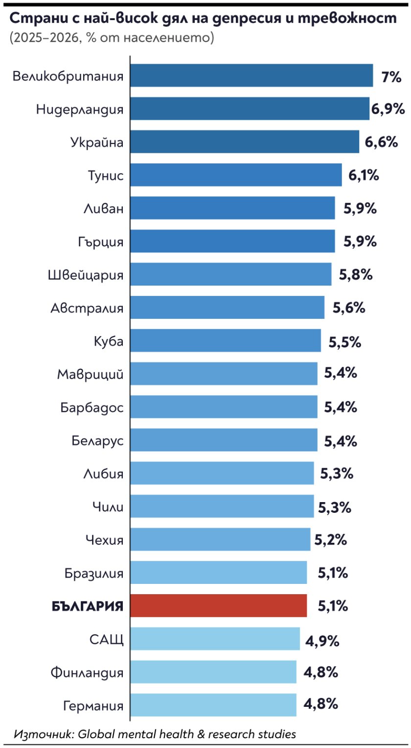 България е 17-а по тревожност и депресии сред първите 20 държави в света с 5,1% от населението, показват данни на Глобален доклад за психичното здраве и изследвания за 2025 и 2026 г.