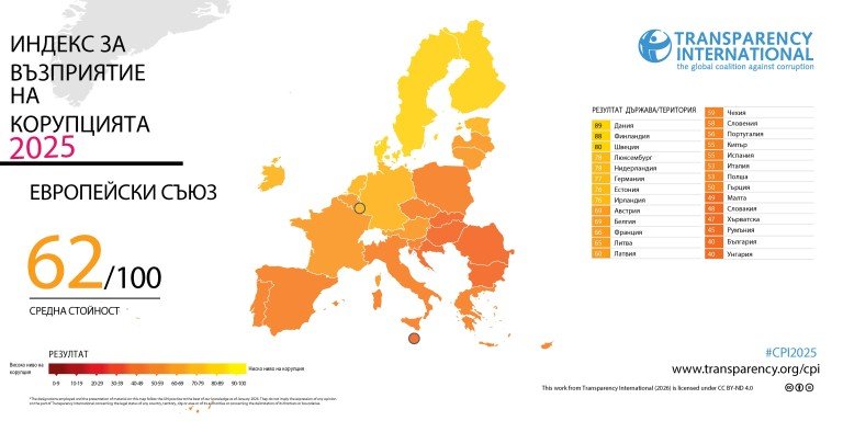 Средната стойност за държавите от Европейския съюз остава 62 точки, което поставя България на последно място заедно с Унгария. Липса на напредък има и при изпълнението на редица препоръки на Европейската комисия, GRECO и Организацията за икономическо сътрудничество и развитие (ОИСР), включително въвеждането на правила за лобизма, стандарти за интегритет и ефективно прилагане на антикорупционното законодателство.