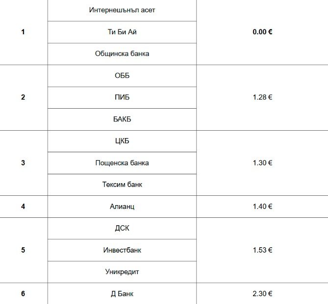 Анализът на тарифите на банките към момента сочи, че една-единствена банка не изисква такса за поддръжка, дори и към нея да няма дебитна карта. При останалите месечната такса е 2,40-2,50 евро (4,69-4,89 лв.).