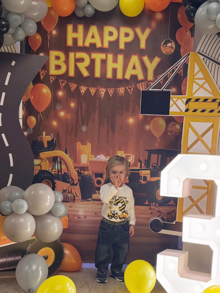 Тържеството е вдъхновено от строителната тематика – любима на много малки момчета. Централно място заема впечатляващата торта, която е дълга 120 сантиметра, украсена с багери, кранове, строителни конуси и табели. Декорацията следва строителната тематика за празника – балони в жълто, оранжево, черно и сиво, както и надпис „Честит рожден ден!“.