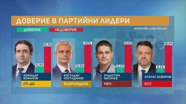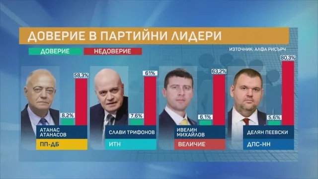Изследването очертава обща тенденция на нарастващ негативизъм към партийните лидери, но прави впечатление, че Делян Пеевски е с изключително висок отрицателен рейтинг – 80% недоверие.