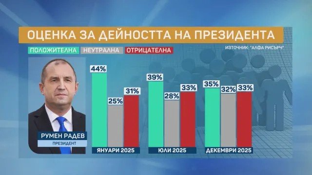 Въпреки общата ерозия на доверие, президентската институция остава „лидер“ сред институционалните рейтинги. Към декември 35% одобряват работата на президента Румен Радев, но тенденцията е низходяща – отчетен е спад от около 10 пункта спрямо началото на годината.