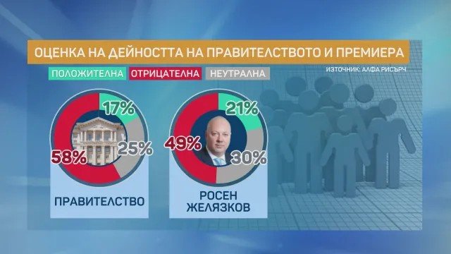 Правителството, което в началото на годината е стартирало с 39% доверие, в края на управлението си „слиза от сцената“ с 17% доверие и 58% недоверие. Аналогична е динамиката и при оценката за работата на премиера Росен Желязков, чийто рейтинг в края е 21%.