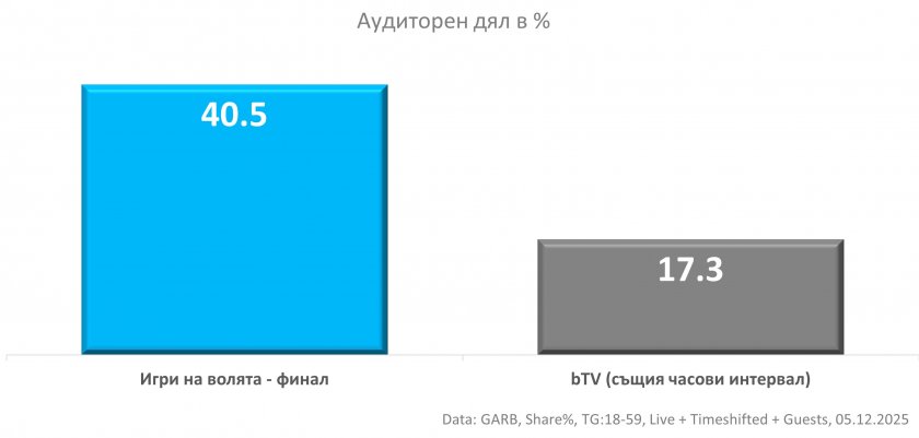 Финалът на екстремния риалити формат „Игри на волята“ бе безапелационен лидер в телевизионния ефир в петък вечер. Битката за голямата победа и наградата от 100 000 лв. на Арената в Дивия север привлече над 40% от всички зрители в активна възраст (18-59 г.). Втората телевизия по това време е с над 2 пъти по-нисък резултат, с отчетен 17.3% аудиторен дял по същото време.