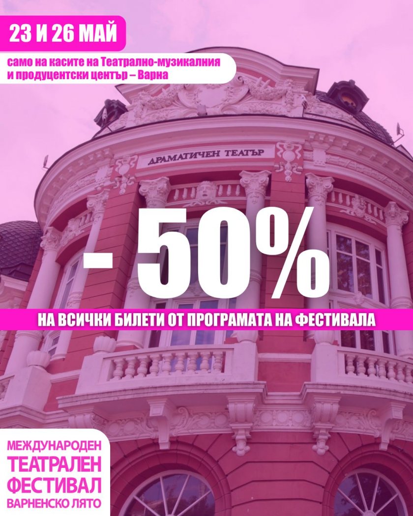 Само на 23 май (петък) (от 10:00 до 13:30 и от 14:30 до 16:00 ч.) и 26 май (понеделник) (от 11:00 до 16:00 ч.) всички билети от програмата на фестивала ще се предлагат с 50% отстъпка на касата на Театрално-музикалния и продуцентски център – Варна.