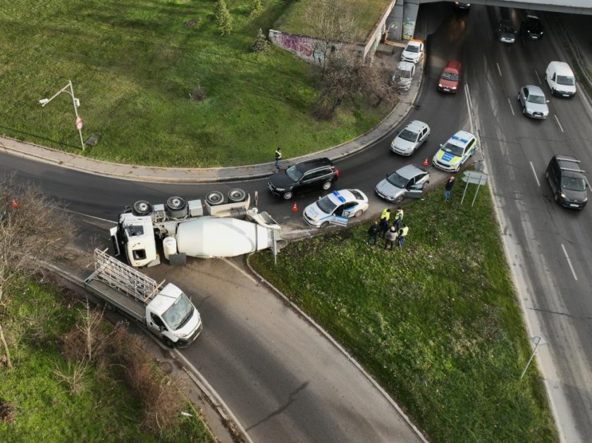 Бетоновоз се обърна на отбивката за качване на бул. "Цариградско шосе" в посока "Телевизионната кула" в столицата. Това стана ясно от публикация във фейсбук групата "Катастрофи в София".