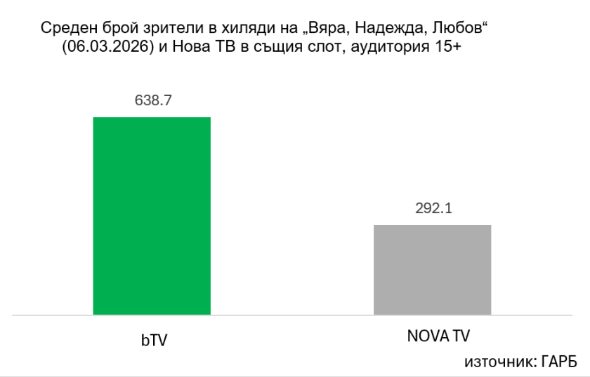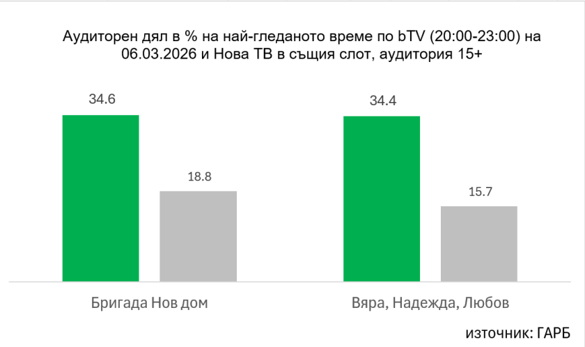 Категорична преднина в петъчната вечер (6 март) бележи bTV с емоционален епизод на „Бригада Нов дом“ и премиерата на новия български сериал „Вяра, Надежда, Любов“, веднага след него. Първият епизод е проследен от 638,7 хиляди зрители в активна възраст (източник: ГАРБ, All 15+), а bTV привлича 34.4 % или над една трета от телевизионната аудитория в петъчната вечер – резултат, който е двойно по-висок спрямо следващата телевизия в класацията. Успехът се пренася и в дигитална среда, където продукцията се нарежда сред трите най-гледани заглавия в платформата VOYO.
