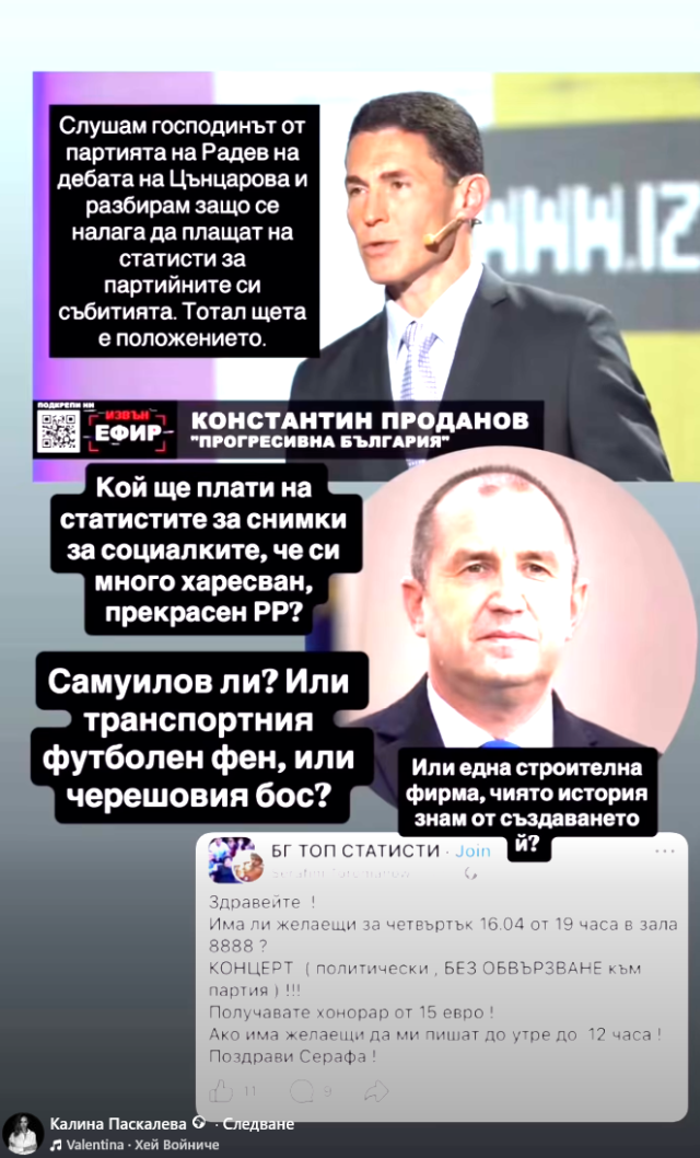 Разследващата журналистка и авторка на бестселъра „Дневникът на една курва“ - Калина Паскалева хвърли предизборна бомба. Тя качи видеоклип, в който намеква, че пловдивските олигарси Илиян Филипов и Георги Самуилов наливат пари в проекта „Румен Радев“.