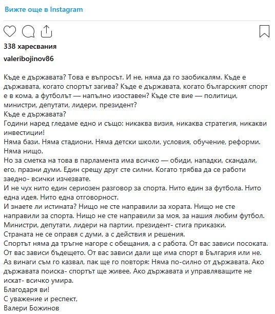 "Къде е държавата? Това е въпросът. И не, няма да го заобикалям. Къде е държавата, когато спортът загива? Къде е държавата, когато българският спорт е в кома, а футболът — напълно изоставен? Къде сте вие — политици, министри, депутати, лидери, президент?