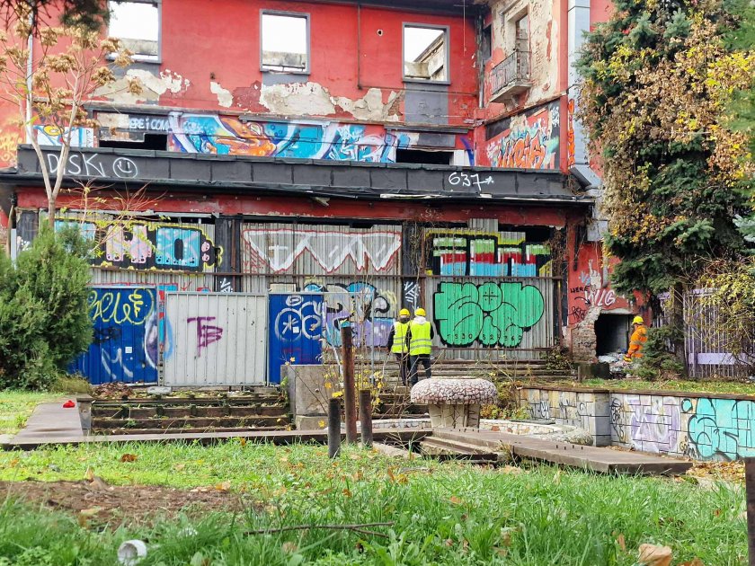 Строителна бригада в запустялата и рушаща се сграда на култовата чалготека „Син Сити“ забеляза тази сутрин зоркото око на Lupa.bg.