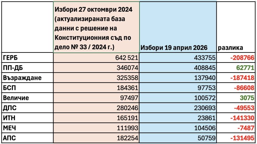 Големият губещ, както стана ясно, е ГЕРБ. Загубата е от цели 208766 гласа. Втори по отлив са Възраждане на Костя Копейкин със 187 418 бюлетини по-малко. Слави Трифонов се спихва със 141 хиляди, а АПС на Ахмед Доган - 131 хилпди.