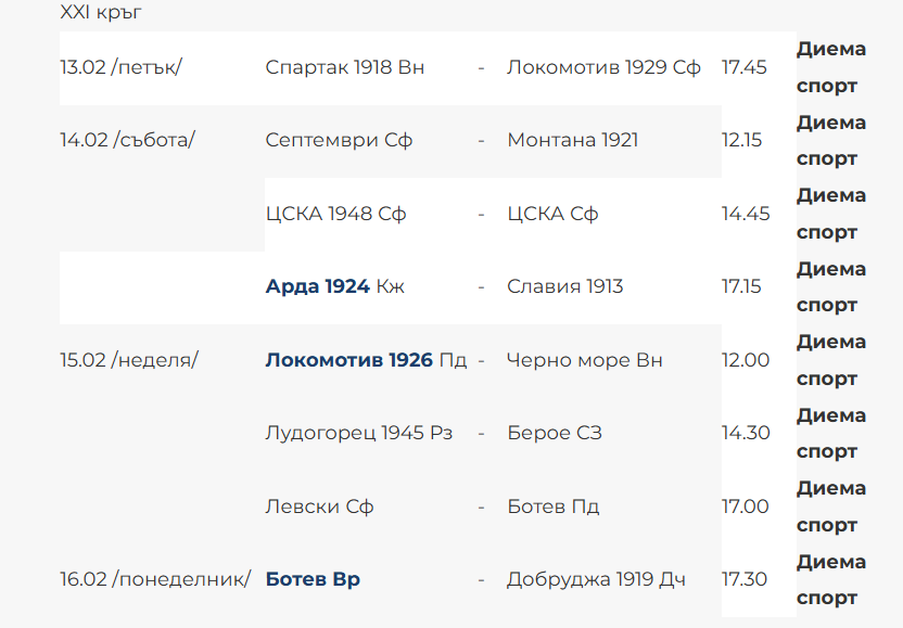 Дербито на кръг №21 е между Левски и Ботев Пловдив, като е ден по-късно от 17:00 ч.