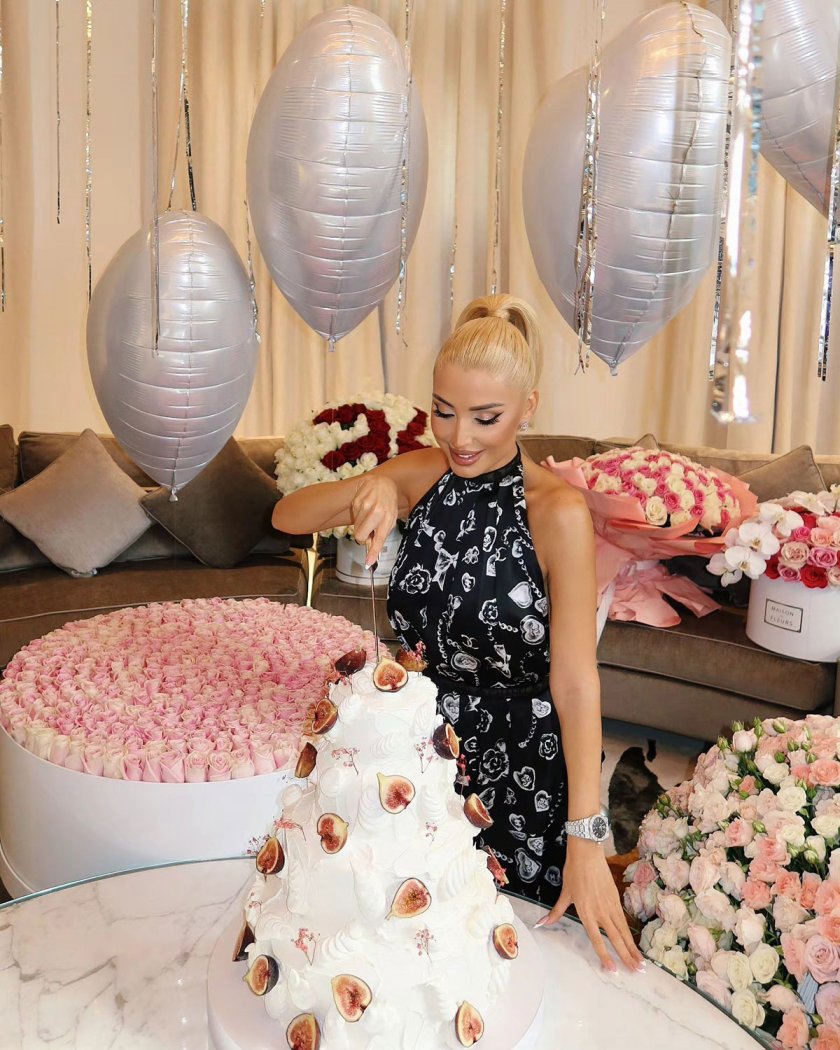 На единия от кадрите е уловен моментът, в който рожденицата разрязва кулинарното бижу на фона на най-различни огромни букети с рози. По всичко личи, че именно това е любимото цвете на певицата. Празничната украса пък е със сребристи балони във формата на сърца.