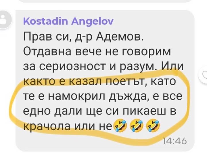 Зам.-шефът на Народното събрание, председател на Съвета за съвместно управление, очевидно вече в оставка, и шеф на здравната комисия в парламента д-р Костадин Ангелов цепи мрака с цветен цинизъм. Лена Бориславова, депутат от ПГ на ПП-ДБ разкри последния фал на д-р Коце, както го наричат и колегите му в НС, от чата на здравната комисия, поддържан между членовете й: