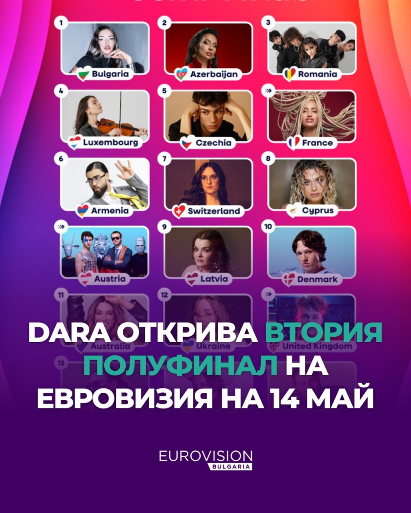 България ще участва във втория полуфинал, като получава стратегически значима, но и предизвикателна позиция – откриваща първа конкурсната вечер. DARA ще открие втория полуфинал с песента „Bangaranga“, която ще прозвучи под номер едно в рамките на общо 15 изпълнения. Десет от тях ще се класират за големия финал на 16 май, определени чрез комбиниран вот от националните журита и зрителите, като правилата остават непроменени – гласуването за собствената държава не е позволено.