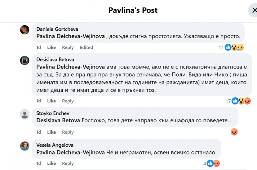 Скоро след това дъщерята на Павел Вежинов - Павлина Делчева, изгря във Фейсбук с циничен коментар, в който подкара с най-грозните думи детето. „Л*йненце“ и „малоумник“ са само част от епитетите, с които наследницата на писателя се впусна да брани ексклузивността си към рода. Цветното словоизлияние, в което не липсват правописни грешки, бързо набра популярност сред съмишлениците и приятелите на Павлина, които с охота се включиха в унижението на детето. Към момчето, което просълзи зрителите на предаването с рецитала си, бяха отправени злоба, цветущи заплахи и груби обиди.