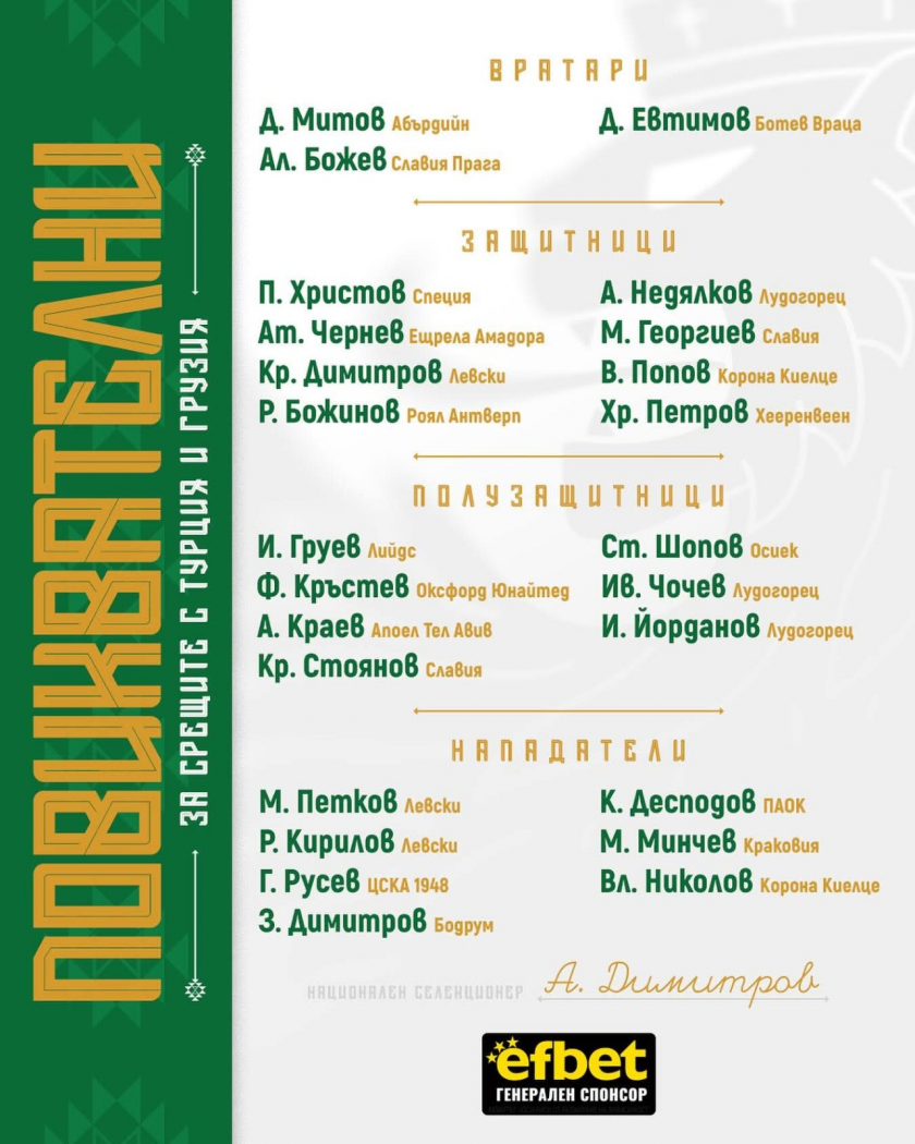 Селекционерът на България Александър Димитров обяви избраниците си за последните две квалификации за Мондиал 2026 срещу Турция в Бурса и Грузия в София. С дебютна повиквателна е вратарят на Славия Прага Алекс Божев.