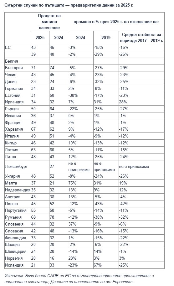 Напредъкът в областта на пътната безопасност варира значително в отделните държави. Между 2024 г. и 2025 г. се наблюдава забележителен спад в Естония (-38%) и Гърция (-22%). Белгия, България, Дания, Полша и Румъния понастоящем са на път да постигнат целта за намаляване с 50% на смъртните случаи по пътищата до 2030 г.