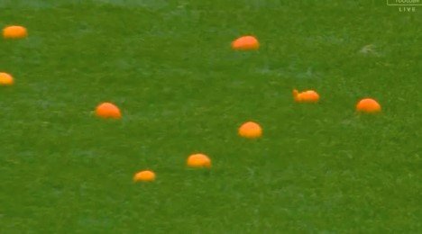 Екшън на терена : Фенове замеряха футболисти с портокали