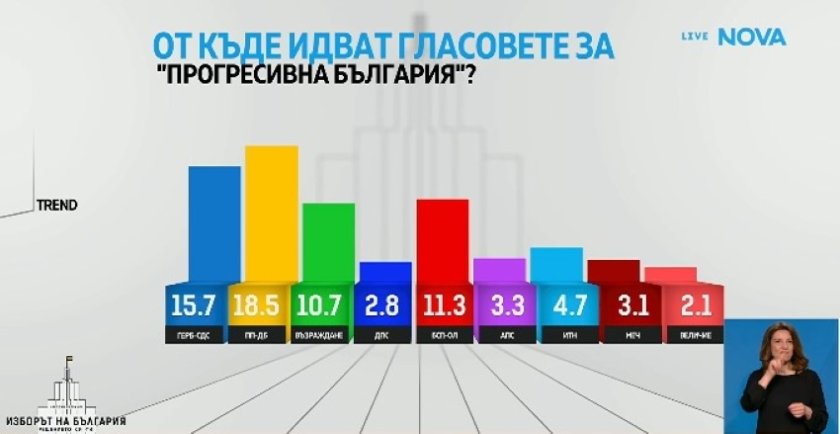 Данните на „Тренд“ показват, че „Прогресивна България“ са взели 15,7% от ГЕРБ-СДС, 18,5% от ПП-ДБ, 10,7% от „Възраждане“, 2,8% от ДПС, 11,3% от БСП-ОЛ, 3,3% от АПС, 4,7% от ИТН, 3,1% от МЕЧ и 2,1% от „Величие“.