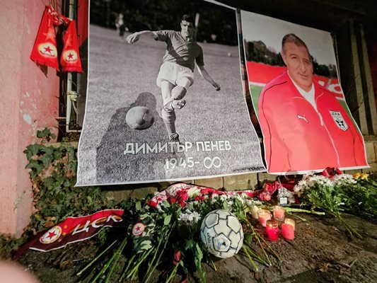 Феновете на ЦСКА натрупаха цветя и шалове пред централния вход на "Българска армия". От клуба направиха мемориал на Димитър Пенев тази вечер, за да може тези, които го обичаха, да изразят скръбта си.