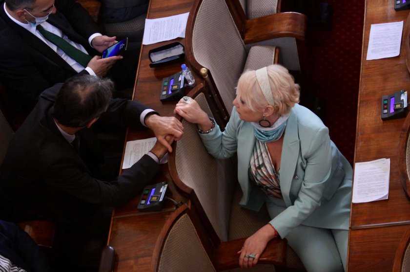 В червената парламентарна група са доста разпасани, показа проверката на Lupa.bg. Нона Йотова не слага маска нито в пленарната зала, нито в кулоарите на парламента. Около врата си има шал, но не го ползва за закриване на устата и на носа. Колегата й от БСП Румен Гечев също не носи маска, докато червеният Крум Зарков спазва мерките.