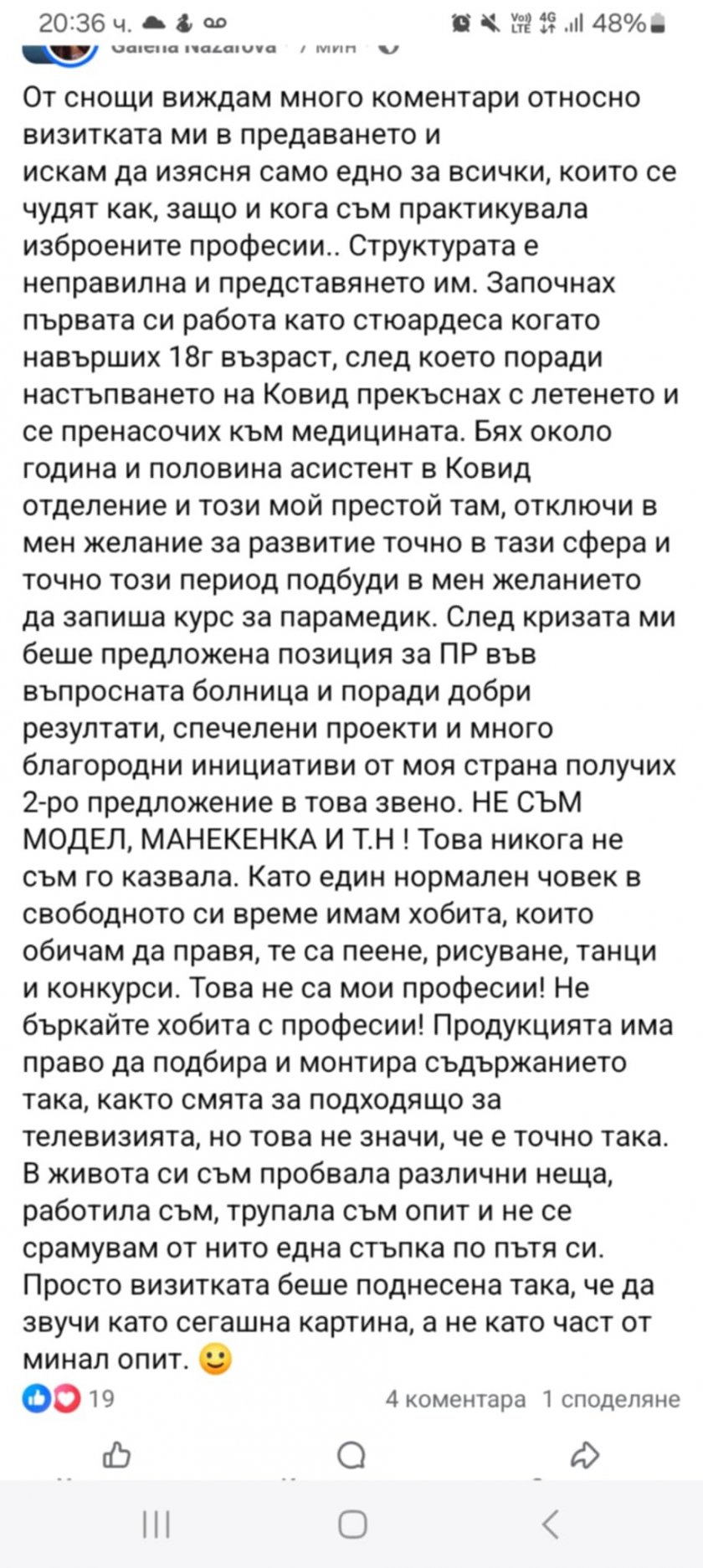 "От снощи виждам много коментари относно визитката ми в предаването и искам да изясня само едно за всички, които се чудят как, защо и кога съм практикувала изброените професии. Структурата е неправилна и представянето им. Започнах първата си работа като стюардеса, когато навърших 18 години. След това, поради настъпването на Ковид, прекъснах с летенето и се пренасочих към медицината. Бях около година и половина асистент в Ковид отделение и този мой престой там отключи в мен желание за развитие точно в тази сфера. Именно този период подбуди в мен желанието да запиша курс за парамедик.