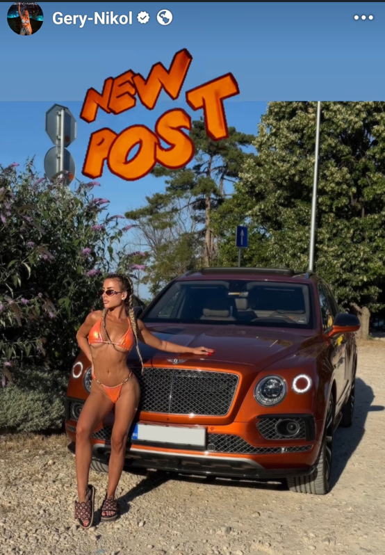 Гери-Никол демонстрира перфектна форма в оранжев бански, а до нея е една от най-желаните коли в света – „Бентли Бентайга“. Снимките са правени в топлите страни, защото у нас вече е за зимни палта. „Уикенд“ първи писа, че поп сензацията е подкарала скъпото возило, което струва около 300 бона. То беше подарък от заможните родители на „яката дупара“.