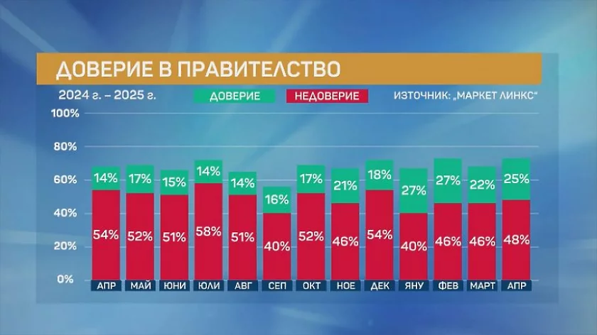 Стабилността и доверието в кабинета се възстановяват в някаква степен, коментира пред пред bTV социологът от "Маркет линкс" Добромир Живков. Проучване на социологическата агенция показва, че през април 25% от анкетираните вярват на правителството, а 48 на сто не одобряват кабинета на Росен Желязков.