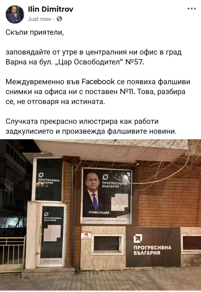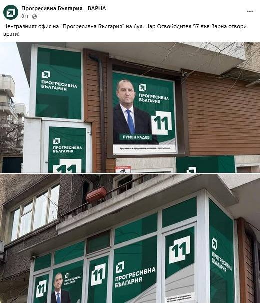 Мистериозна снимка от офиса на "Прогресивна България" във Варна взриви фейсбук пространството. На нея се вижда сграда, облепена с няколко плаката на Румен Радев с логото на партията и, забележете, номер на бюлетина - царското число 11.