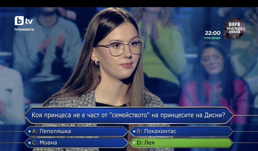 Издънката е особено брутална, защото пък вчера беше зададен въпрос без верен отговор. Участничка беше запитана: Коя героиня не е принцеса на Дисни? Отговорите бяха Пепеляшка, Покахонтас, Моана и Лея.