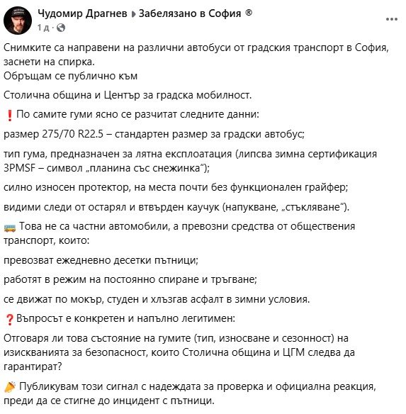 Сигнали от граждани и шофьори поставят под въпрос безопасността на част от автобусите от градския транспорт в София през зимния сезон. Според снимки в социалните мрежи, някои превозни средства се движат с силно износени гуми, които не отговарят на зимните условия и създават риск за пътниците и останалите участници в движението.
