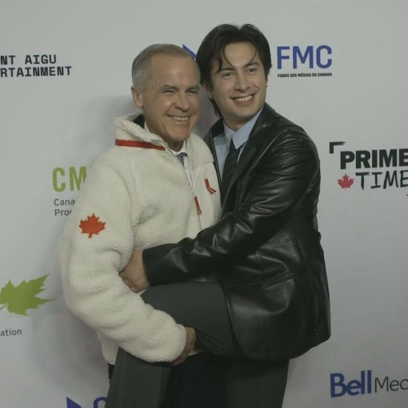 Премиерът Марк Карни и звездата от „Heated Rivalry“ Хъдсън Уилямс споделиха нещо различно от прегръдка на червения килим на Prime Time 2026 в Отава