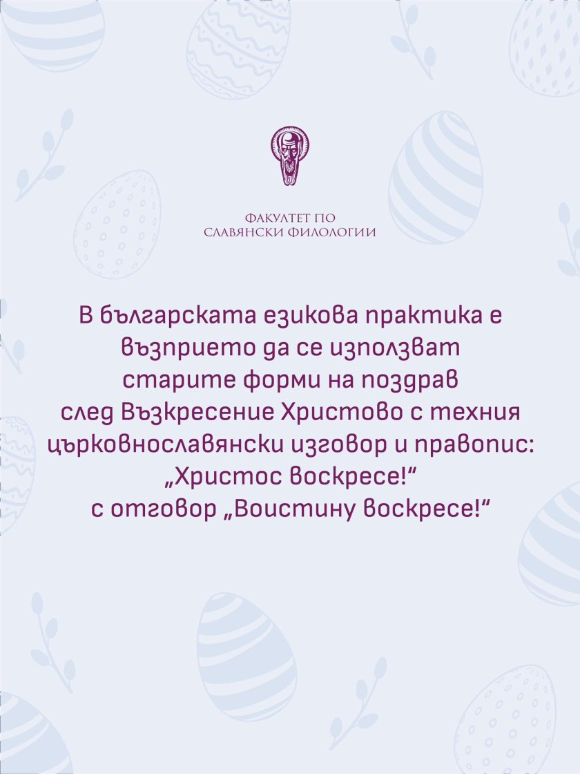 Според българската езикова практика, поздравът след Възкресението с църковнославянски правопис е "Христос воскресе!", а отговорът е "Воистину воскресе!" Това уточняват от Факултета по славянски филологии в СУ "Св. Климент Охридски".