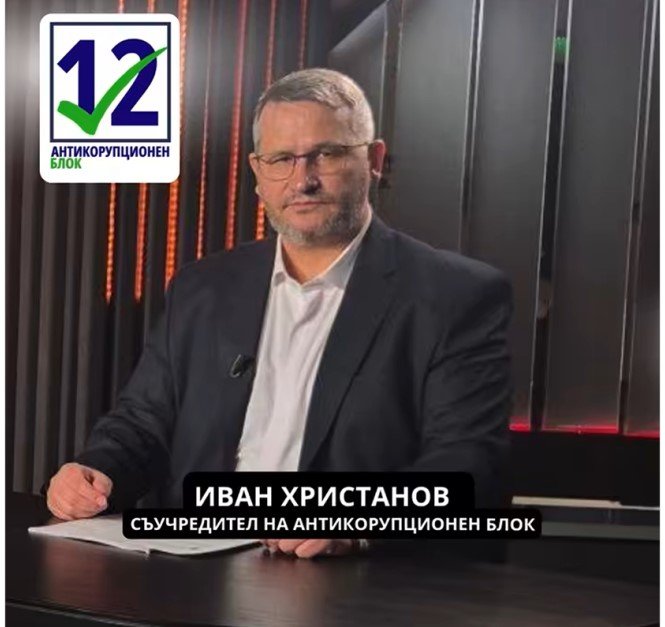 Под изображението е поместен надпис "Министъра на народа" и "Иван Христанов - съосновател на Антикорупционен блок".