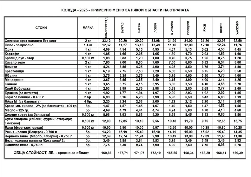 Изследването сравнява цените на основните продукти за Коледа в различни градове у нас. Средно коледната трапеза ще струва около 170 лева за четиричленно семейство.