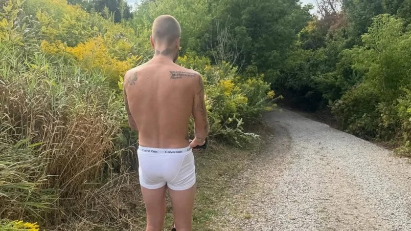 Певецът, който наскоро навърши 31 години, е сниман незнайно от кого без дрехи и обувки, демонстрирайки непринудено настроение и доза самоирония пред камерата.
