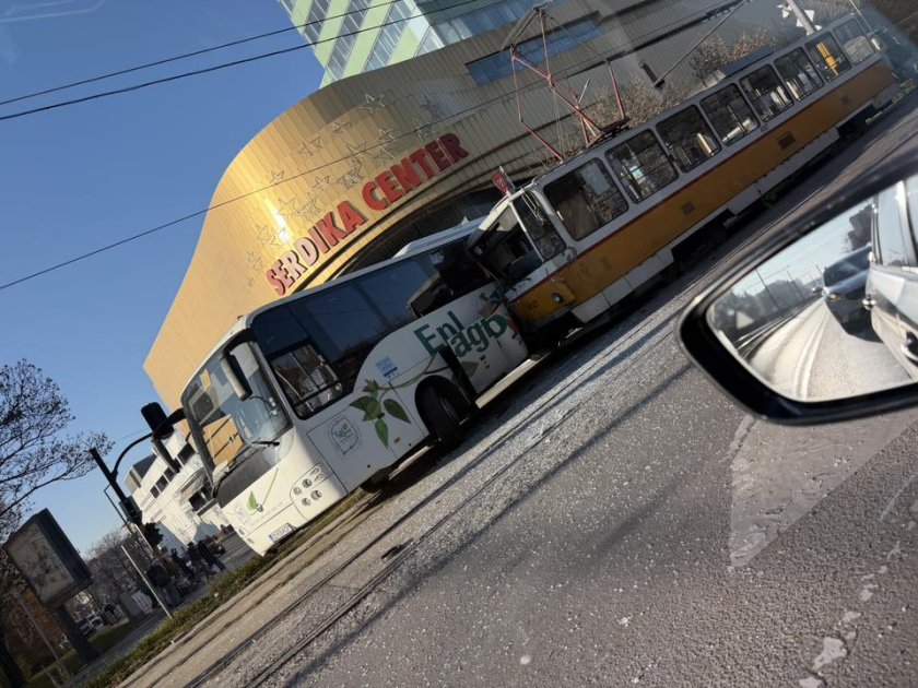 Трамвай по линия номер 20 е катастрофирал с автобус в района на мол "Сердика", съобщават очевидци. Мотрисата е нацелила рейса с табела "Случаен превоз" точно по средата.