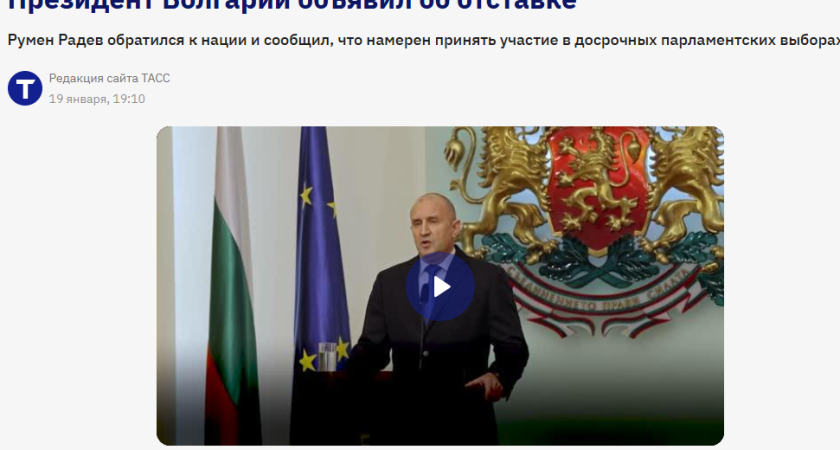 Руската информационна агенция "ТАСС" е публикувала с час предварително новината, че българският президент Румен Радев хвърля оставка. Това става ясно от твърдение, подплатено със скрийншот, на депутата Явор Божанков, според когото явно медийният гигант в Москва е бил информиран в 18:00 часа московско време (20:00 часа наше или един час след обръщението на държавния глава, излъчено по БНТ и БНР) за намеренията на Радев.