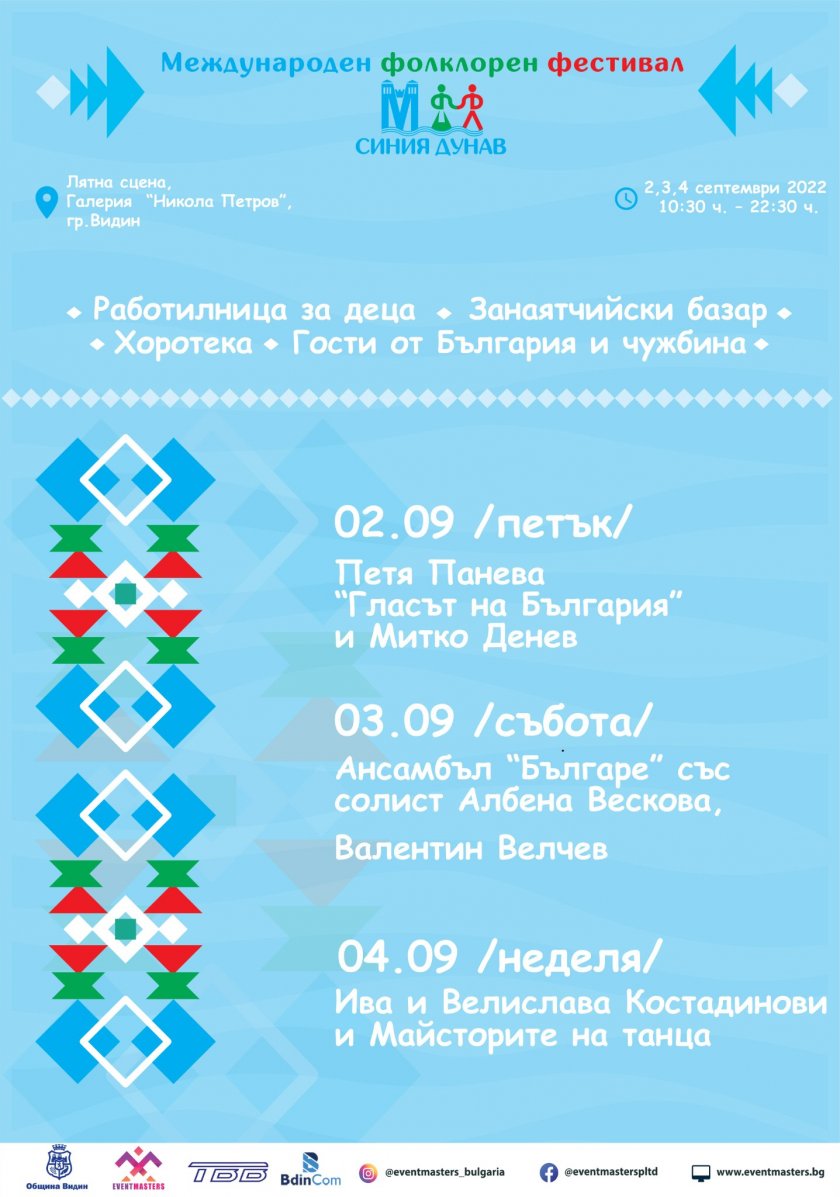 На 4 септември любимите на видинската публика Ива и Велислава Костадинови заедно с „Майсторите на танца“ ще потопят публиката в магията на българското фолклорно песенно и танцово изкуство, поднесено по един модерен и различен начин. МФФ „Синия Дунав“ ви очаква за един истински незабравим фолклорен празник.