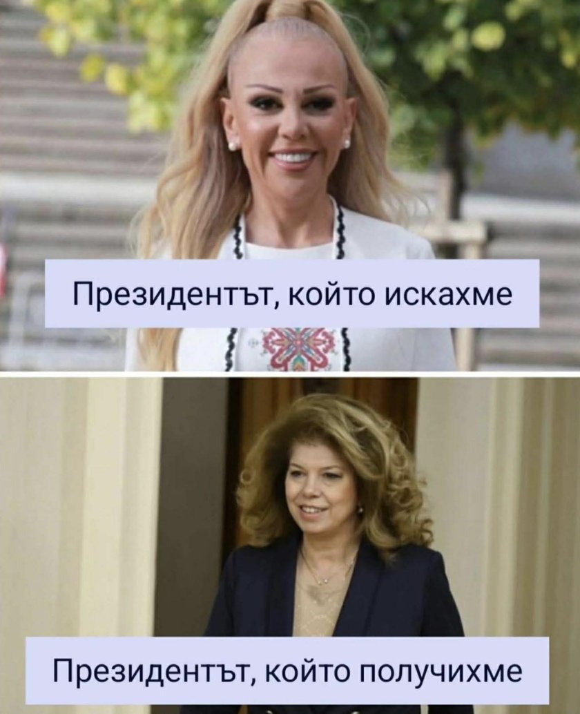 Певицата пусна в социалните мрежи снимка, генерирана с изкуствен интелект, на която позира редом до Радев. Вместо с обичайните си лъскави сценични тоалети, този път Луна е пременена в строг официален костюм с бяла риза – очевиден намек за „държавнически“ образ.