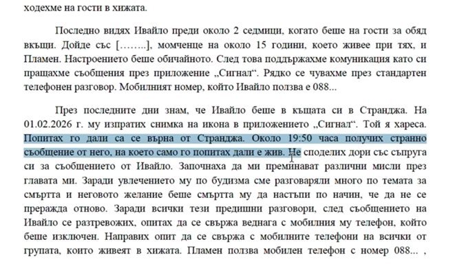 "Попитах го дали се е върнал от Странджа. Около 19:50 получих странно съобщение от него, на което само го попитах дали е жив. Заради увлечението му по будизма сме разговаряли много по темата за смъртта и неговото желание беше смъртта му да настъпи по начин, че да не се преражда отново. Заради всички тези предишни разговори след съобщението на Ивайло се разтревожих. Опитах се да се свържа веднага с мобилния му телефон, който беше изключен".