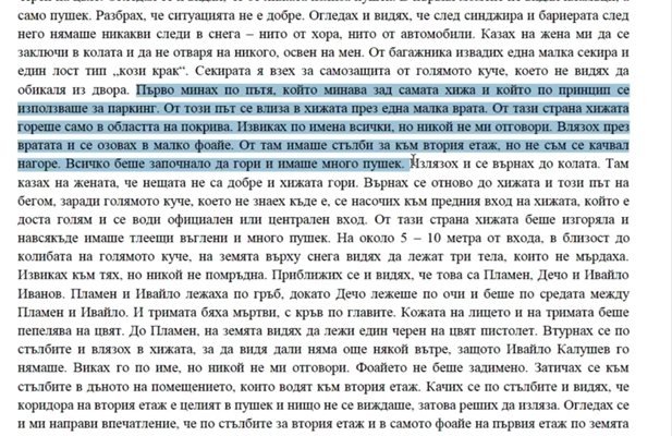 "Първо минах по пътя, който минава зад самата хижа и който се използваше за паркинг. От тази страна хижата гореше само от страната на покрива. Извиках по имена всички, но никой не ми отговори. Насочих се към предния вход на хижата. От тази страна хижата беше изгоряла. Имаше тлеещи въглени и много пушек. На около 5-10 м от входа, в близост до колибата на голямото куче, върху снега, видях да лежат три тела, които не мърдаха. Приближих се и видях, че това са Пламен, Дечо и Ивайло Иванов. Пламен и Ивайло лежаха по гръб, докато Дечо лежеше по очи и беше по средата. И тримата бяха мъртви с кръв до главите. До Пламен на земята видях да лежи един черен на цвят пистолет. Качих се по стълбите и видях, че коридорът на втория етаж е целият в пушек и нищо не се виждаше, затова реших да изляза. Във фоайето на първия етаж по земята имаше разпръснати много гилзи, може би десетки на брой, точно като на филм с голяма престрелка. Гилзите бяха с дължина до 4 см и дебели 7-8 мм и бяха пръснати навсякъде по земята. Според мен гилзите не бяха от патрони за пистолет, а по-дълги и със сигурност по-дебели", сочат показанията на Деян, които разпространи Нова.