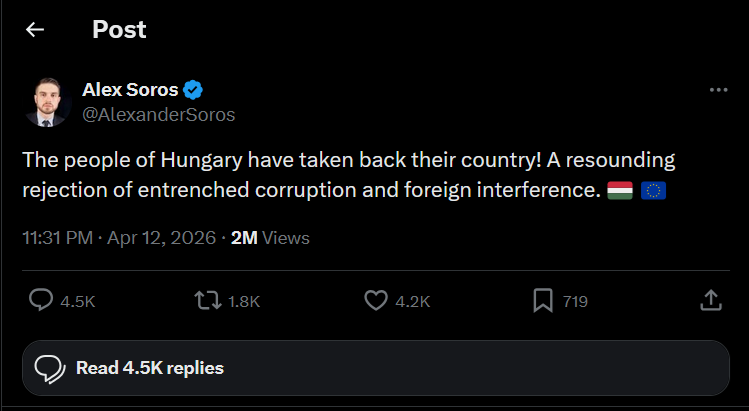 Джордж Сорос е американски финансист от унгарски произход, инвеститор и филантроп и основател на фондация „Отворено общество“ (OSI). Припомняме, че опозиционната партия „Тиса“ спечели 138 от 199 места в унгарския парламент. Бъдещият министър-председател Петер Мадяр, след като спечели мнозинство от две трети, заяви, че са освободили Унгария.