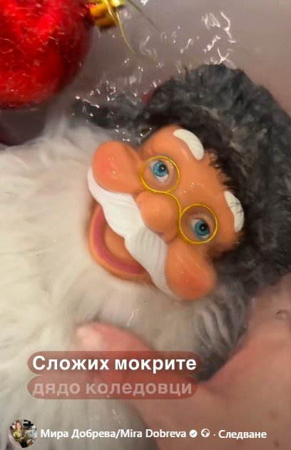 Журналистката Мира Добрева сподели пред почитателите си, че се налага да къпе Дядоколедовци, защото помещението, в което съхранявала коледната си украса се наводнило. Изкуственият интелект я посъветвал да изхвърли играчките, но Добрева решила да направи напук и да измие и подсуши всичко.