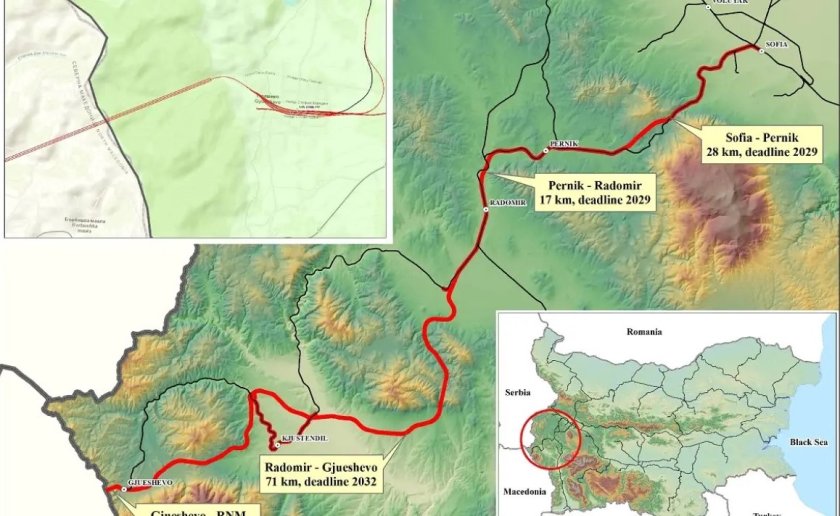 За изпълнител на проекта „Модернизация на железопътната линия София – Перник – Радомир, жп участък Перник - Радомир“ (с дължина 17 км според скицата) на първо място е класиран участникът ДЗЗД „ИСПА“ с договорна цена 421 283 219 лв. без ДДС. Инвестицията предвижда модернизация на участъка Перник – Радомир, изграждане на двойна жп линия за скорости до 160 км/ч, обновяване на коловозното развитие в гарите и пълно премахване на пресичанията на едно ниво с пътния и пешеходния трафик. Срокът за изпълнение е до средата на 2029 г.